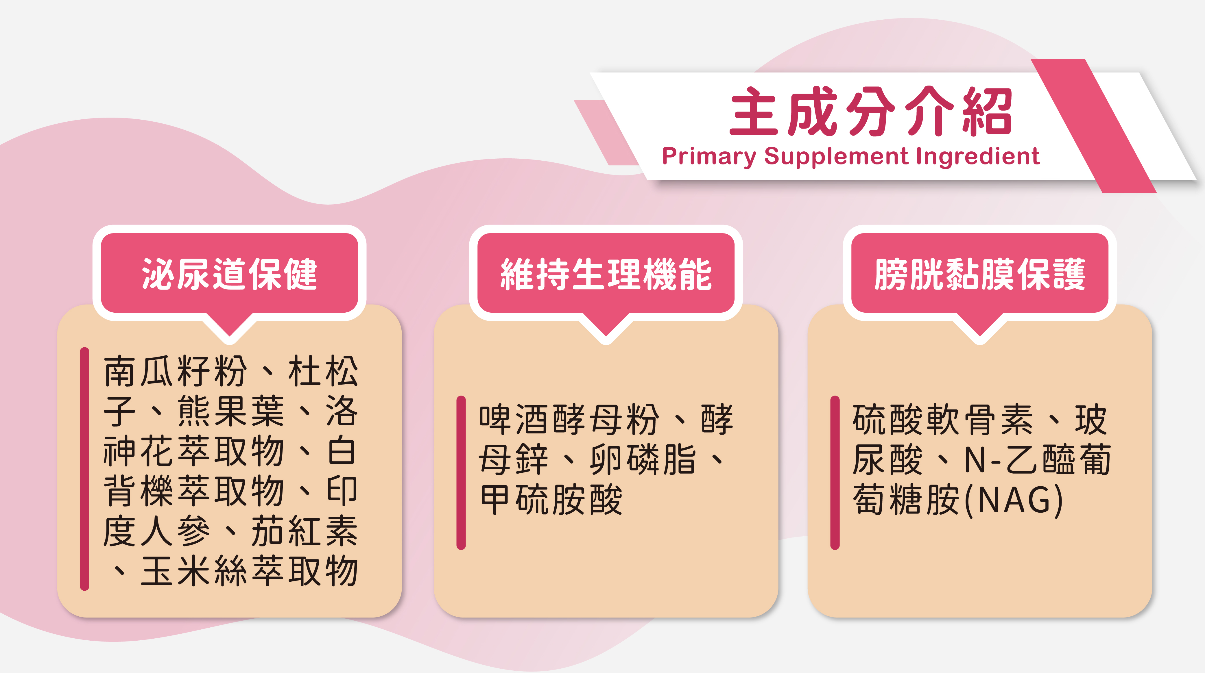 含植物萃取泌尿道保健成分,保護泌尿系統及膀胱內膜。