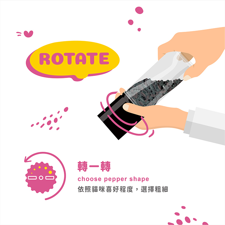 打開蓋子後,將研磨旋扭逆時針轉開1圈,並開始轉動研磨罐,胡椒貓研磨後,撒在食物中或直接餵食貓咪,可調整研磨旋扭鬆度,選擇喜好的粉粒大小。