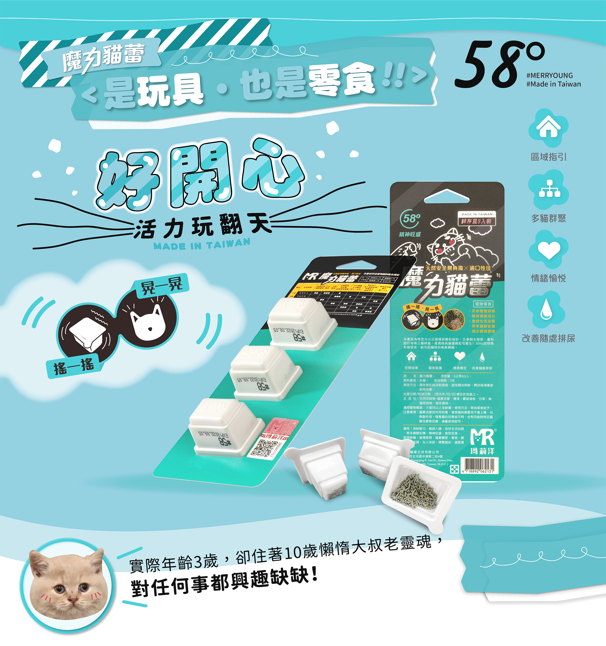 「實際年齡3歲,卻住著10歲懶惰大叔老靈魂,對任何事都興趣缺缺!魔力貓蕾-開心58°,試圖勾起大叔內心的小小好奇心!」